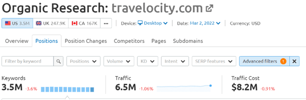Metrik “Biaya Lalu Lintas” adalah upaya Semrush untuk memberikan metrik “biaya penggantian” untuk menunjukkan nilai taksiran kehadiran organik Anda (yaitu, jika Anda harus membayar lalu lintas ini melalui Google Ads, berapa biaya yang mungkin Anda keluarkan, per bulan )