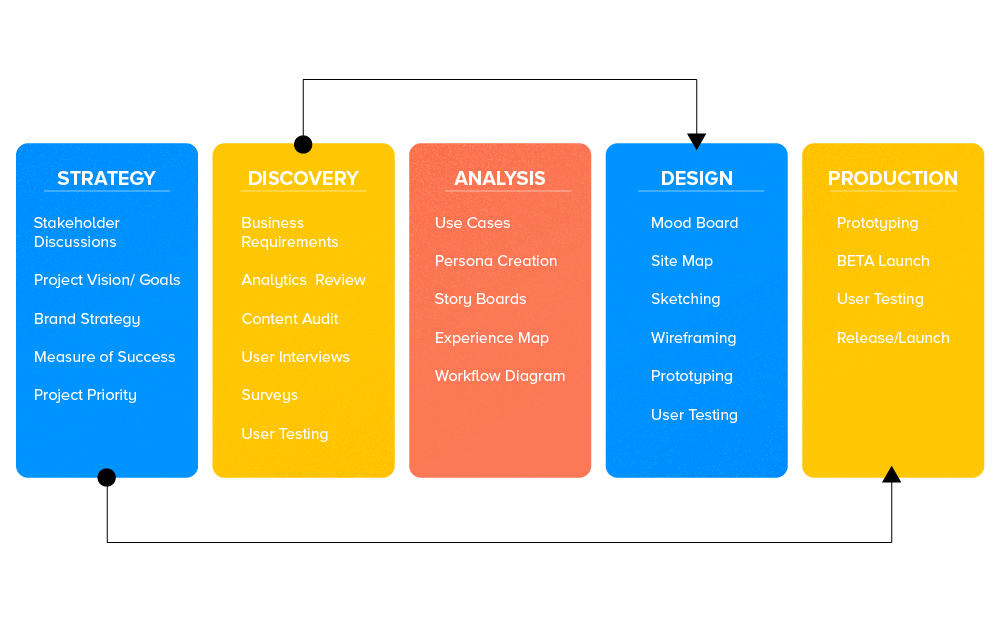 Pada fase ini, Desainer Produk berkonsentrasi pada Desain Visual produk. Riset dan analisis pengguna yang mendalam, membuat pemetaan persona dan perjalanan, mood boarding, dan wireframing – semua aspek riset dan perencanaan produk digabungkan untuk mengembangkan aplikasi canggih dengan desain yang luar biasa.