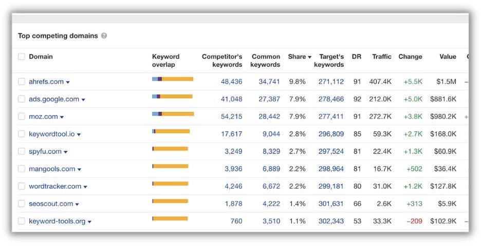 - Anda juga dapat menggunakan alat SEO seperti Ahrefs, Moz, dan sejenisnya untuk melakukan analisis tumpang tindih kata kunci, yang pada dasarnya adalah strategi yang disebutkan di atas, tetapi dalam skala yang lebih komprehensif.