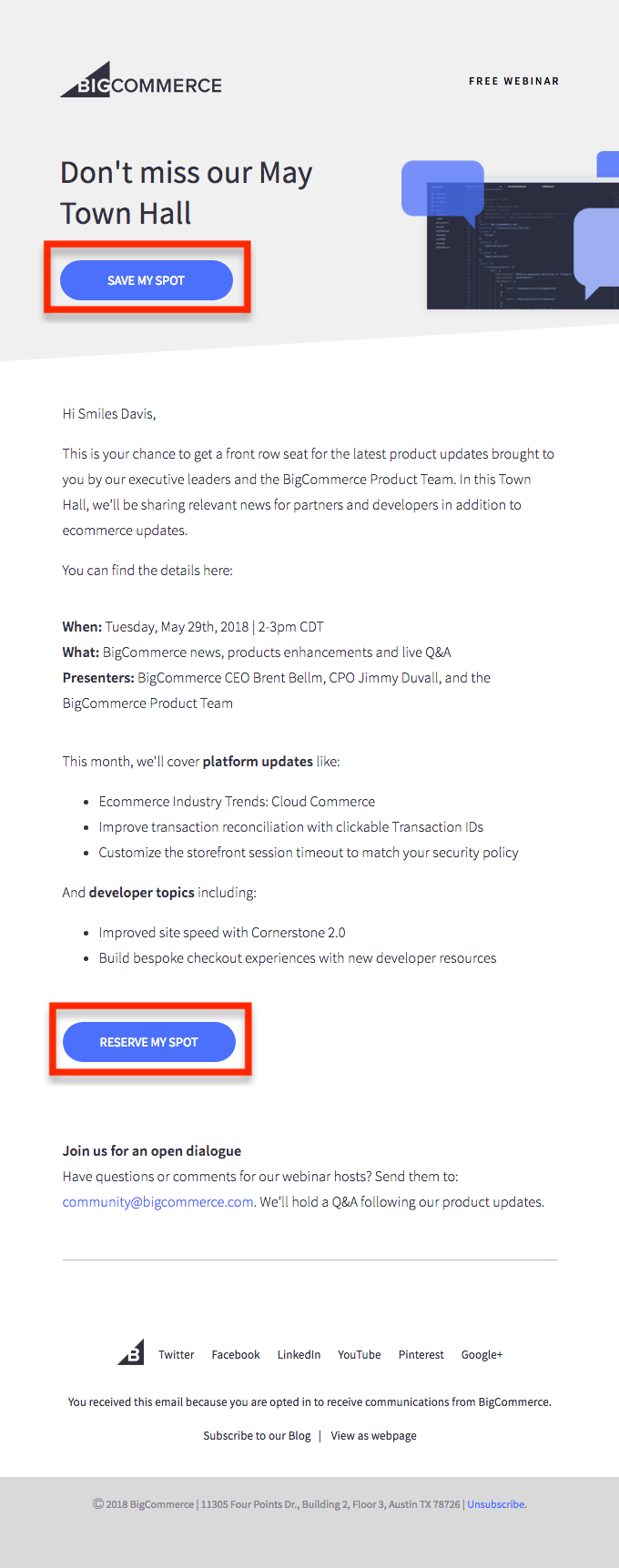 Ketika BigCommerce mempromosikan Pertemuan Balai Kota Mei mereka, mereka jelas ingin memastikan orang dapat mendaftar dengan cepat dan mudah dengan menambahkan CTA di bagian atas email.
