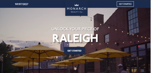 Paro atas, halaman arahan untuk Monarch Realty Co. terlihat sangat mirip dengan halaman lain yang akan Anda lihat. Ada tayangan slide gambar yang relevan untuk area layanan perusahaan yang bergulir di latar belakang, dan ada tombol "Memulai" yang mengarahkan pengunjung situs ke informasi kontak perusahaan.