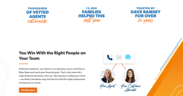 Namun, halaman dimulai dengan ajakan bertindak — temukan agen real estat melalui Ramsey Solutions — dan pusat desain lainnya menjelaskan mengapa calon pembeli atau penjual ingin melakukan itu.
