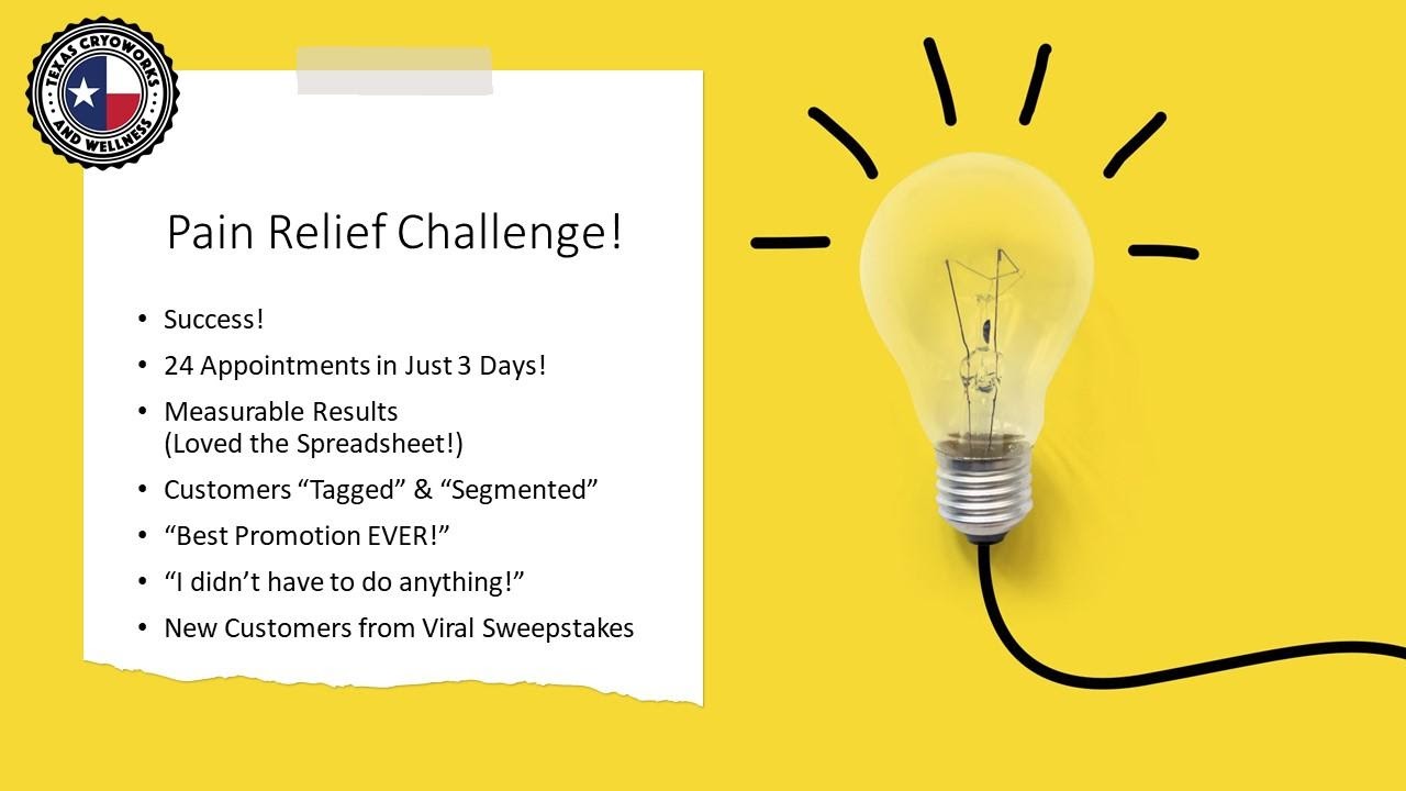 Dalam kasus Texas Cryoworks, mereka mendapat beberapa pilihan keluar. Mereka juga mendapat 24 janji temu baru dan 11 rujukan baru yang setara dengan pendapatan potensial puluhan ribu dolar.