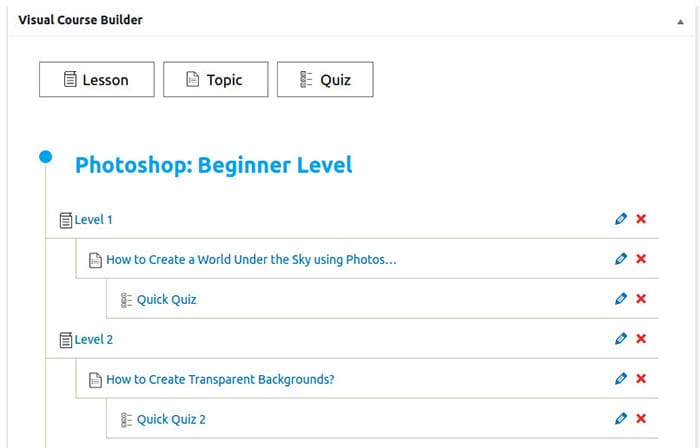 Tidak hanya itu, Anda juga dapat membuat topik dan menambahkan pelajaran di bawah kursus dan melihat hierarki memperbarui dirinya sendiri secara real time. Mampu melihat seluruh struktur memudahkan pembuat kursus untuk mengetahui apakah semua topik dan pelajaran ditempatkan dengan benar.