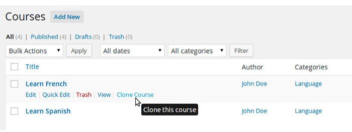 Setelah menginstal dan mengaktifkan ekstensi Content Cloner, Anda akan melihat opsi 'Klon' di bawah setiap Kursus di pengaturan admin LearnDash.