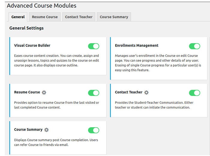 Ini menawarkan banyak ekstensi yang melakukan berbagai fungsi. Plugin kaya fitur ini memiliki banyak fungsi seperti konten drip feeding, beragam jenis pertanyaan, persyaratan kursus yang fleksibel, dan banyak lagi.