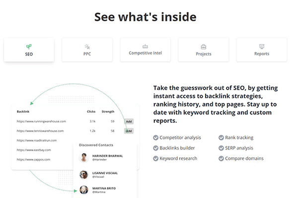 - Analisis situs web pesaing, penelitian kata kunci, dan pelacakan peringkat kata kunci.