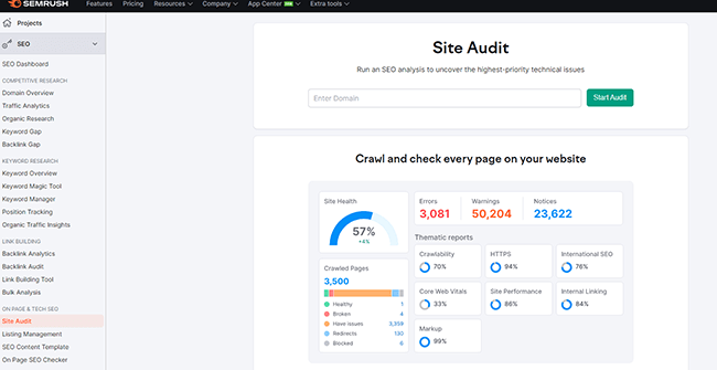 Semrush adalah salah satu alat SEO all-in-one terkemuka. Termasuk adalah salah satu alat audit SEO terbaik — dan untuk alasan yang bagus juga. Ini memiliki lebih dari 130 pemeriksaan saat mengaudit situs web, mulai dari kemampuan merangkak dan kecepatan halaman hingga profil backlink dan pemeriksaan keamanan.