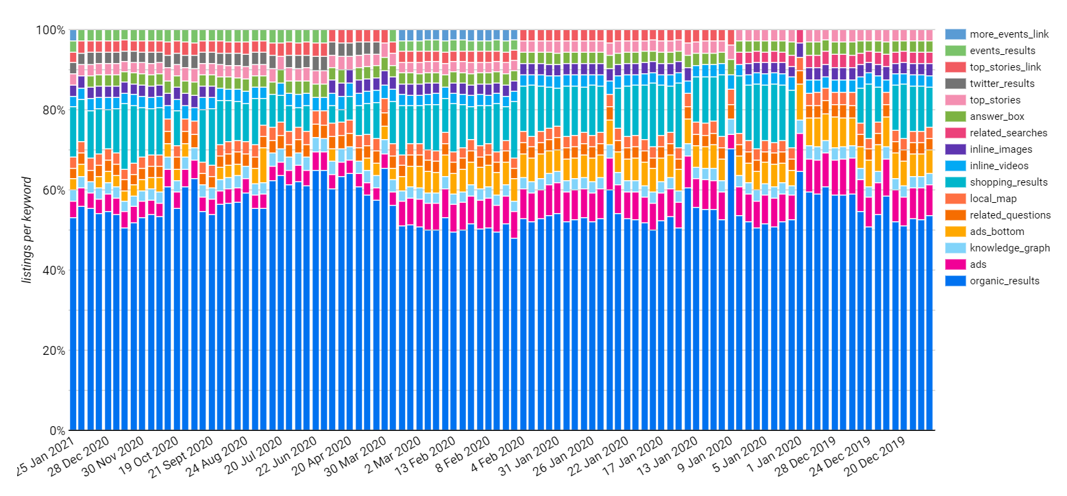 Dengan menggunakan data yang dikumpulkan di platform intelijen pencarian milik kami, SERPR, kami dapat melihat bagaimana frekuensi berbagai fitur SERP berubah dari waktu ke waktu, memberikan wawasan tentang bagaimana maksud dan hasil berubah sejalan dengan perilaku pengguna.