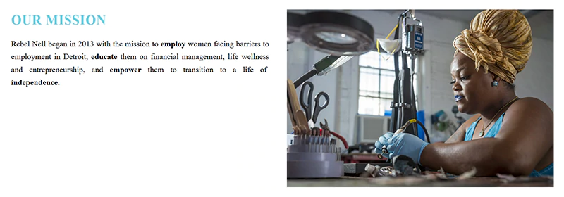 Ambil Rebel Nell, misalnya. Rebel Nell adalah 'bisnis berbasis dampak sosial'. Perusahaan mempekerjakan wanita yang sedang dalam transisi dari tunawisma dan berjuang untuk menemukan dan mempertahankan pekerjaan di Detroit.