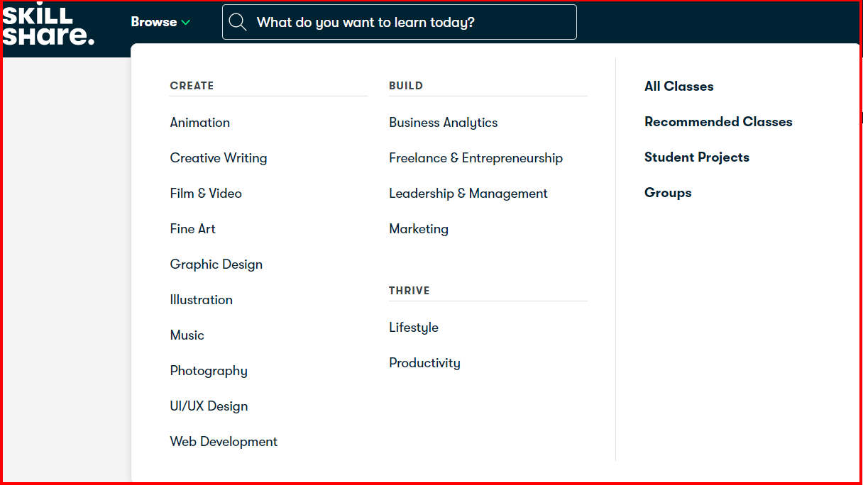 Misalnya, meskipun banyak platform menawarkan e-learning dan memiliki sejumlah besar kursus yang berbeda. Mereka merekomendasikan dan mempromosikan hanya beberapa kursus seperti TI atau bisnis. Di sisi lain, Skillshare berkonsentrasi pada variasi daripada memilih satu area dan tidak mengabaikan topik lainnya. Ini adalah konsep yang hebat dan mempromosikan berbagai subjek kepada pengguna.
