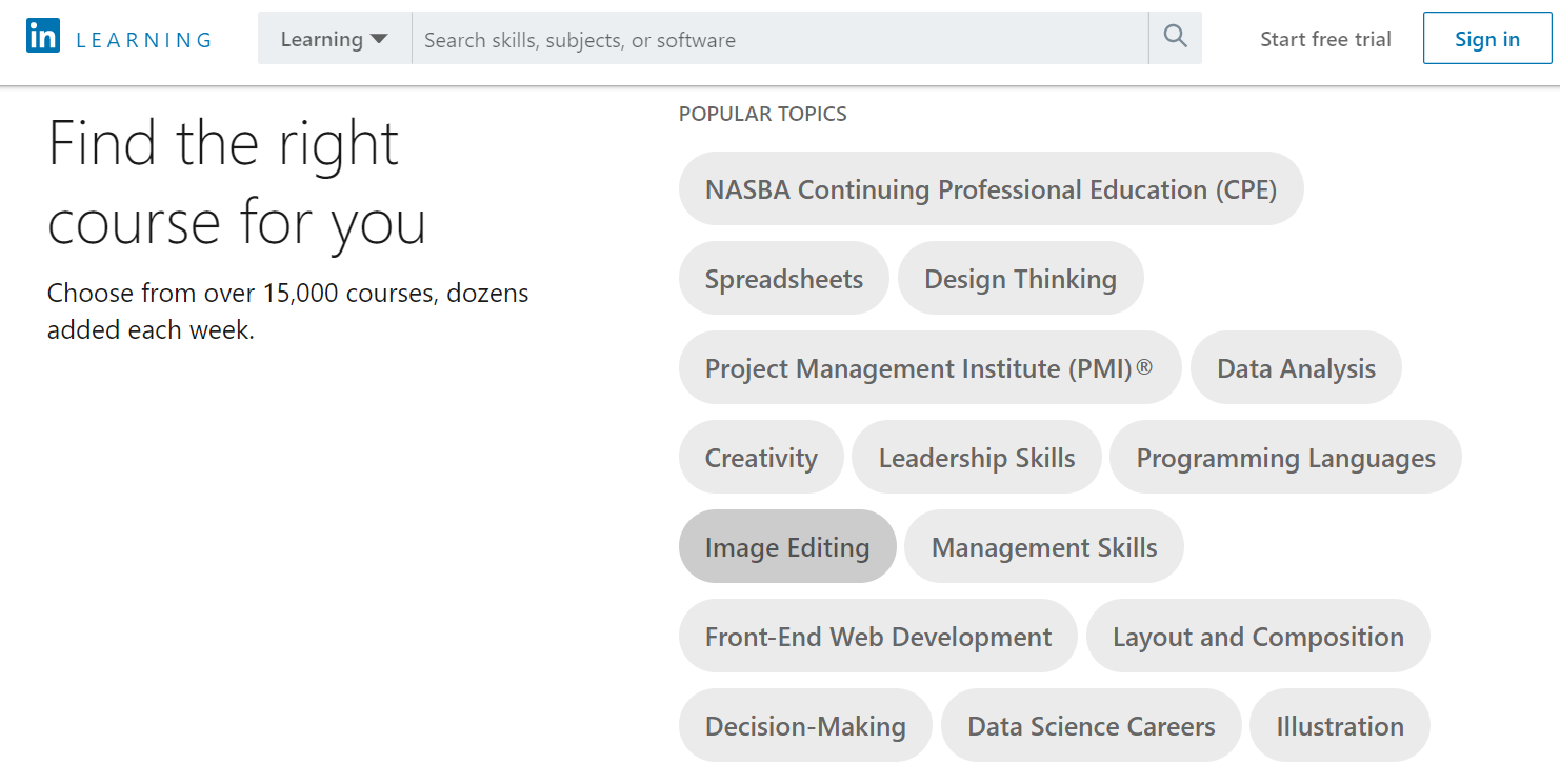 Saya ingin merekomendasikan Anda untuk menggunakan paket premium karena Anda mendapatkan akses ke banyak kursus. Lynda adalah platform e-learning yang lebih profesional dan Anda dapat menemukan kursus yang melayani pengembangan web, TI, dan beberapa tentang fotografi, dll.