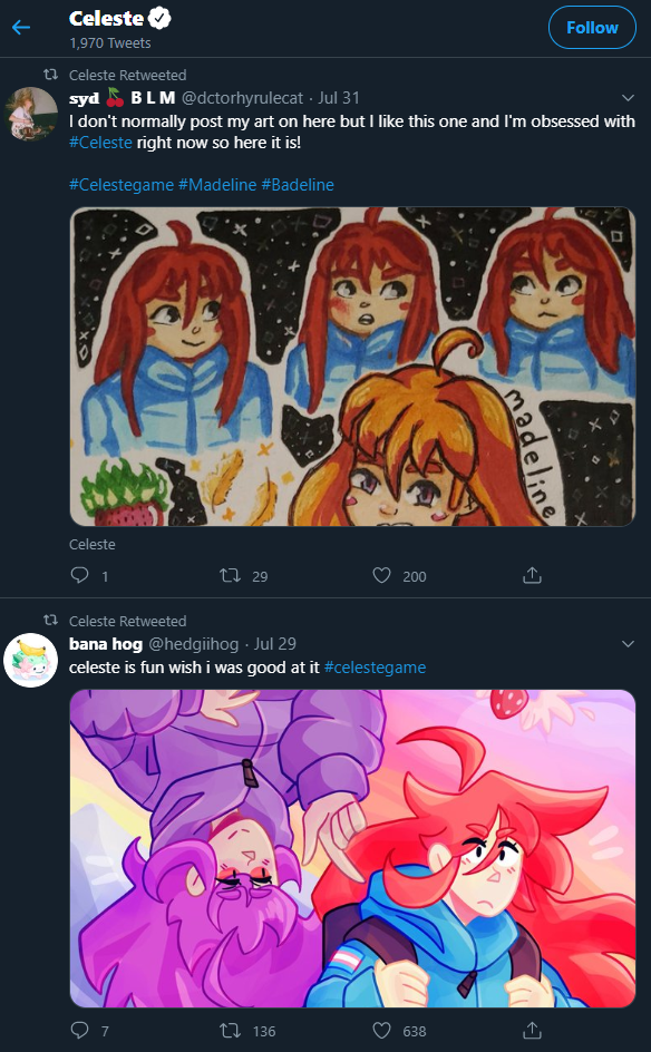 Dengan kata lain, pastikan untuk meneriaki penggemar Anda saat mereka menunjukkan cinta kepada Anda. Misalnya, akun Twitter Celeste secara teratur membagikan konten buatan pengguna seperti fanart.
