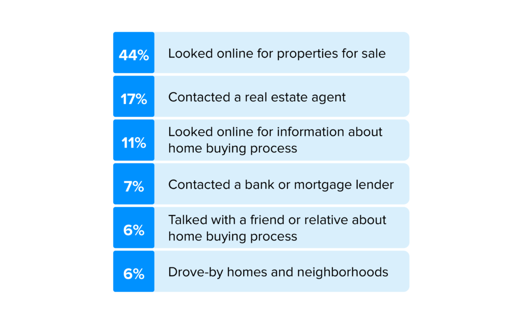 Berikut adalah grafik yang menggambarkan hasil survei yang dilakukan oleh National Association of Realtors tentang cara orang menelusuri properti –