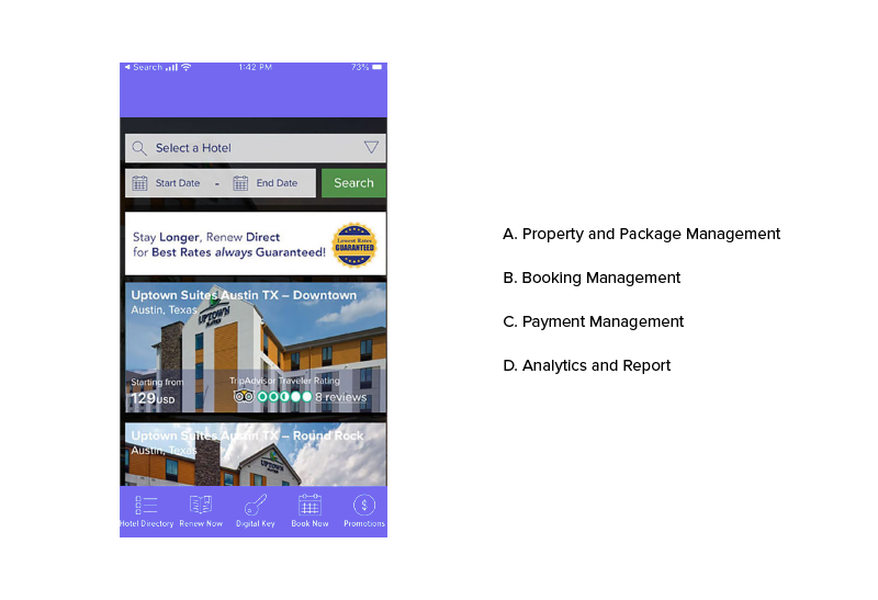 Dengan menggunakan tab hotel, pelanggan akan dapat melihat detailnya: detail akomodasi, ketersediaan kamar pada tanggal yang diinginkan, sewa kamar, fasilitas, peringkat dan ulasan, dll. dalam satu ketukan. Aturannya di sini adalah sedeskriptif mungkin – cukup untuk tidak menimbulkan kebingungan.