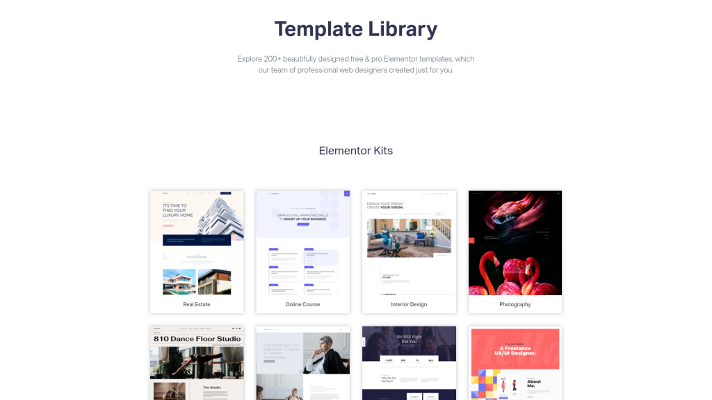 Elementor juga memiliki perpustakaan template yang dapat Anda telusuri untuk mencari inspirasi. Kami memiliki kit dan template yang tersedia untuk berbagai elemen situs web dalam berbagai vertikal:
