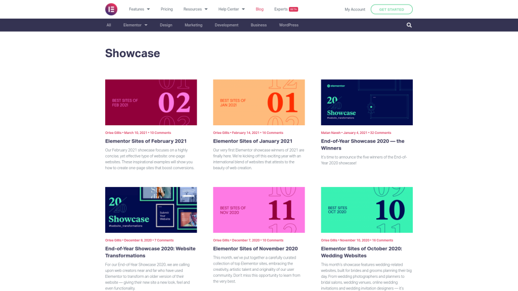Anda dapat melihat etalase bulanan Elementor. Di sini, Anda akan menemukan situs web yang dibuat dengan hati-hati menggunakan Elementor. Setiap bulan, etalase kami berfokus pada tema yang berbeda, seperti situs web satu halaman atau situs pernikahan: