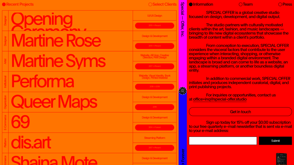 Tren kemunduran yang menyenangkan ini sangat berwarna. Anda benar-benar dapat berkreasi dengan warna psikedelik dan menghadirkan banyak kegembiraan ke situs web Anda, seperti yang dilakukan Penawaran Khusus, Inc.: