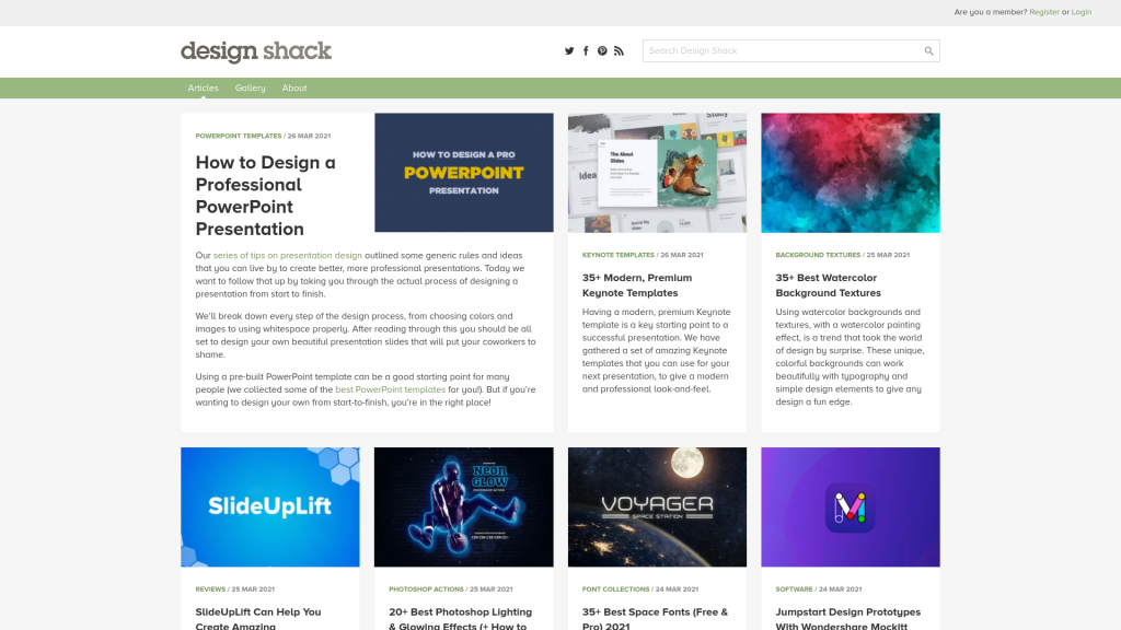 Design Shack adalah majalah online untuk desainer dan pengembang web. Anda akan menemukan banyak informasi yang dapat ditindaklanjuti serta galeri desain: