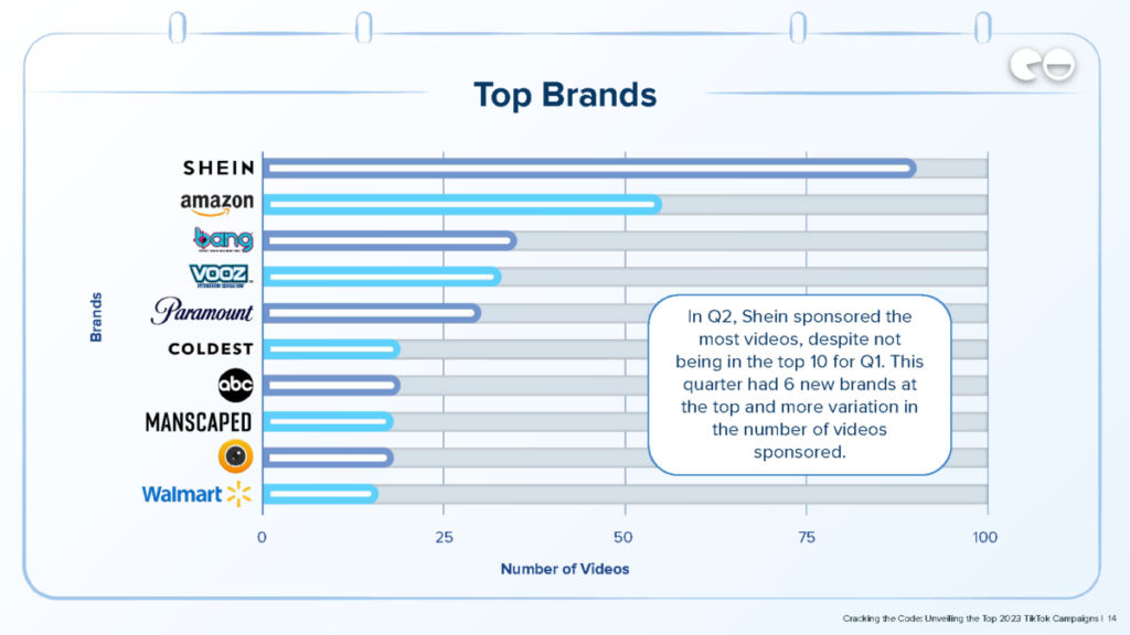 Di Q2, Shein mensponsori video paling banyak, meski tidak masuk 10 besar untuk Q1. Kuartal ini memiliki 6 merek baru di puncak dan lebih banyak variasi dalam jumlah video yang disponsori.