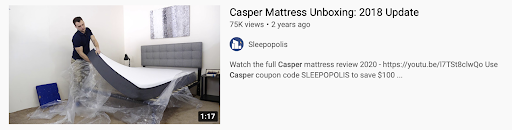 Orang-orang diberi kode diskon untuk dibagikan kepada audiens mereka dan Casper meminta mereka untuk membagikan video mereka membuka kotak kasur Casper mereka. Berikut adalah 3 video unboxing (dari banyak) dengan 59.000 tampilan, 140.000 tampilan, dan 75.000 tampilan.