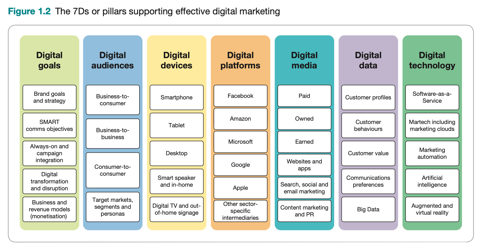 Sebagai bagian dari menentukan ruang lingkup peluang saat menggunakan pendekatan strategis untuk pemasaran digital, sebaiknya pikirkan tentang interaksi audiens digital mana yang perlu kita pahami dan kelola melalui komunikasi pemasaran. Pemasaran digital saat ini adalah tentang mengelola lebih banyak jenis interaksi audiens daripada sekadar situs web perusahaan atau pemasaran email. Ini melibatkan pemanfaatan semua '7D lain dalam mengelola interaksi pemasaran digital' yang ditampilkan dalam visual di bawah ini