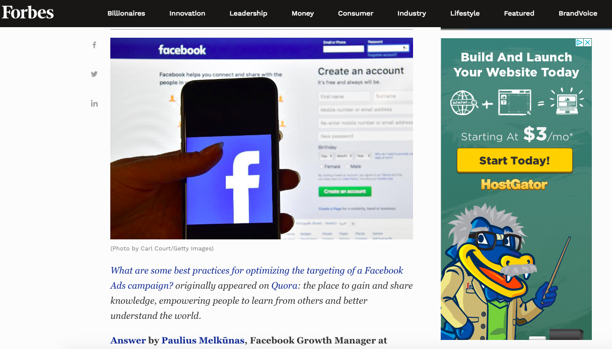 Iklan bergambar adalah iklan spanduk yang Anda lihat di situs web di mana pun. Misalnya, inilah iklan bergambar Datafeed di situs web Forbes: