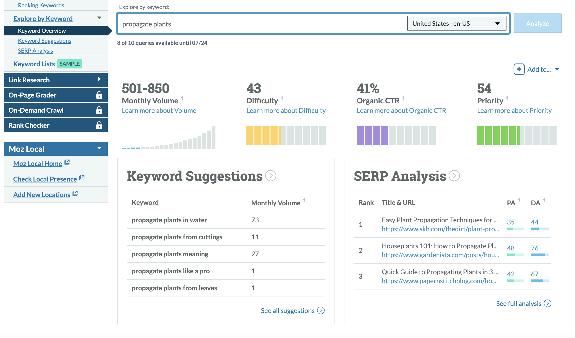 Alat kata kunci sangat berguna saat mengaudit SEO di metadata YouTube Anda. Moz menawarkan alat Penjelajah Kata Kunci gratis hingga 10 kueri kata kunci dalam sebulan yang dapat membantu Anda mengidentifikasi kata kunci yang paling relevan dan paling banyak ditelusuri untuk digunakan dalam judul video, deskripsi, dan lainnya.