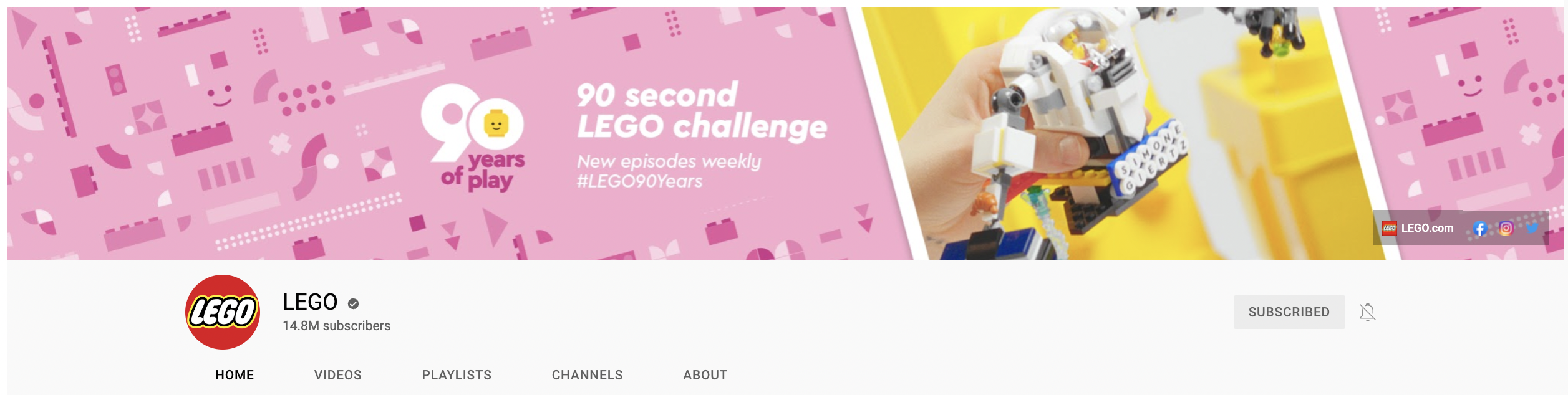 Selain memastikan gambar spanduk Anda sesuai merek, berkreasilah. Spanduk LEGO yang cerah dan menarik mencakup informasi tentang serial mingguan di saluran mereka.