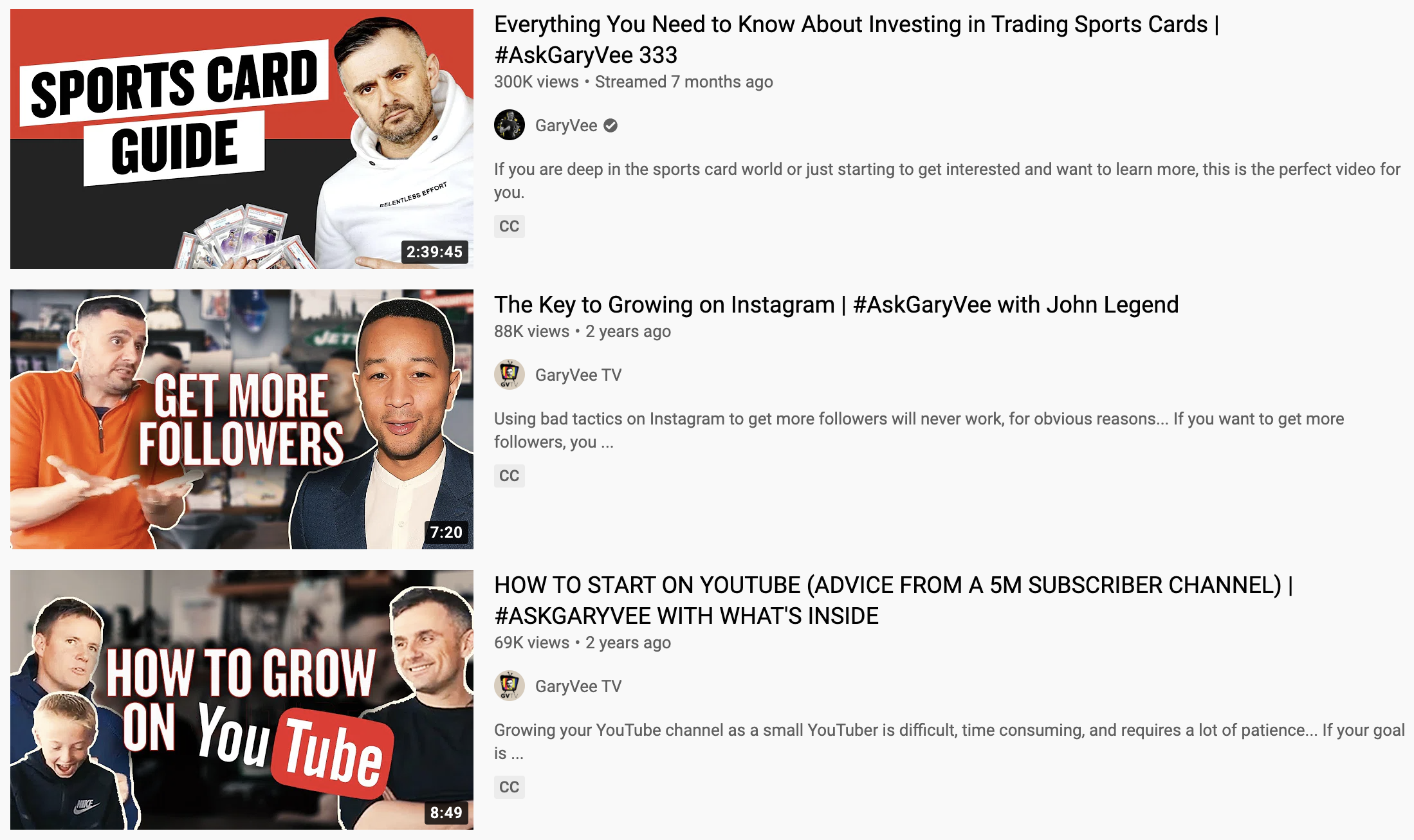 Seri video populer lainnya yang dapat dicari pengguna melalui hashtag adalah #AskGaryVee. Dia menambahkan hashtag itu ke dalam judul videonya sehingga semua video yang relevan akan muncul di pencarian, seperti yang Anda lihat di bawah.