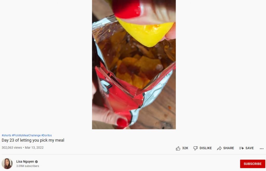 Lisa Nguyen, YouTuber makanan, terkenal dengan Celana Pendeknya yang lucu dan menarik. Salah satu cara kreatifnya menggunakan YouTube Shorts adalah dengan membiarkan penggemarnya memilih makanannya dan mencoba makanan tersebut melalui Shorts.