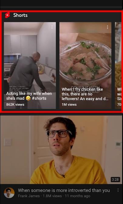 Selain itu, pengguna juga dapat menemukan Celana Pendek yang direkomendasikan saat menggulir halaman beranda YouTube di aplikasi. Pemirsa dapat menonton salah satu dari Shorts ini bahkan sambil menonton video YouTube biasa. Video secara otomatis dijeda ketika mereka mengklik Shorts dan secara otomatis dilanjutkan setelah pemirsa menutup Shorts.