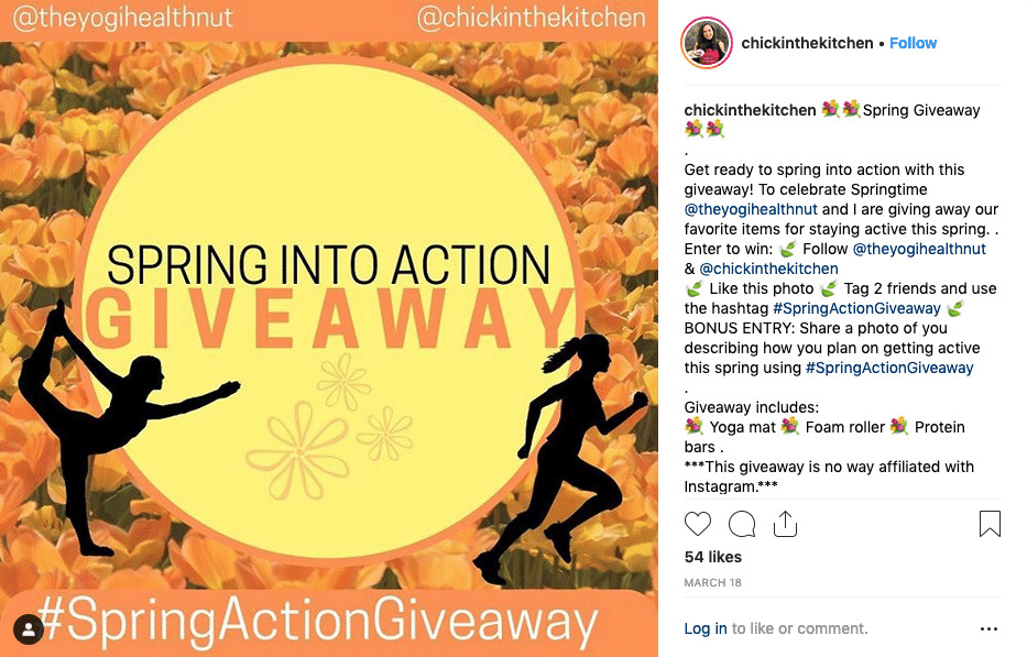 Chiedendo ai partecipanti di pubblicare una foto con l'hashtag del tuo marchio, non solo raccoglierai contenuti generati dagli utenti da utilizzare per ulteriore marketing, ma aumenterai la consapevolezza del marchio e aiuterai ad aumentare la rilevabilità della tua attività. In questo concorso, ai partecipanti viene chiesto di pubblicare una foto con l'hashtag #SpringActionGiveaway che conterà come un'iscrizione bonus a questo concorso.