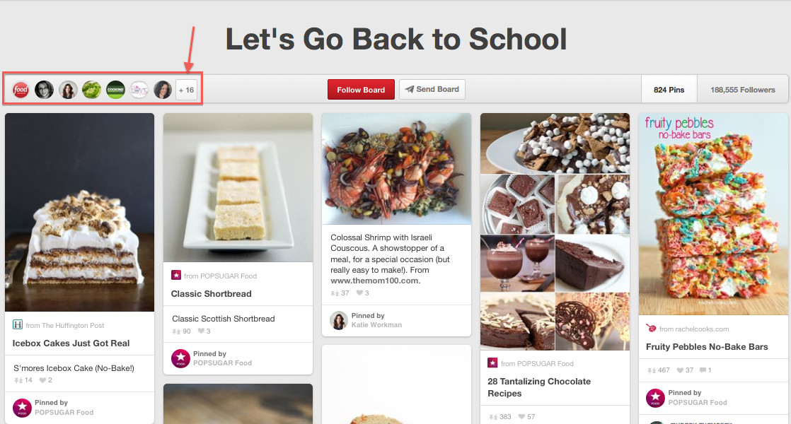 La bacheca Pinterest "Let's Go Back to School" di Food Network ha più contributori che vanno da siti Web come il blog di cucina della CNN, Eatocracy, The Cooking Channel, vari chef, autori di libri di cucina, blogger/fotografi locali, siti Web senza glutine e latticini e altro ancora .
