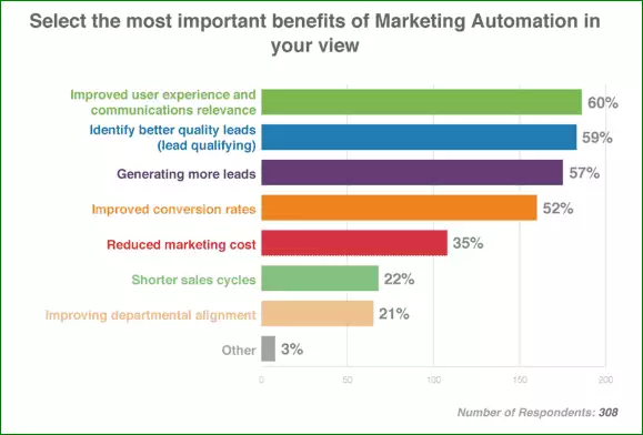- – Le aziende di marketing B2B incluse nello studio Smart Insights and Communicator's Managing B2B Marketing Automation in 2019hanno ritenuto che i vantaggi più importanti dell'automazione del marketing siano il miglioramento dell'esperienza utente e la pertinenza delle comunicazioni (60%), la qualificazione dei lead (59%), la generazione di più lead (57%) percento) e tassi di conversione migliorati (52 percento)