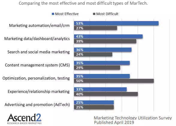 - Nel frattempo, il seguente MarTech è in cima alla lista degli strumenti più difficili: ottimizzazione/personalizzazione/test (50%), esperienza/relationship marketing (40%) e marketing/dati/dashboard/analytics (39%).