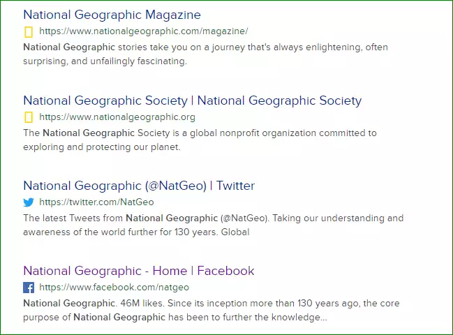 Neil Patel sottolinea che l'algoritmo dei risultati di ricerca di Bing include segnali sociali. Inoltre, i risultati di ricerca di Google servono anche ai profili dei social media aziendali. Ad esempio, gli account Twitter e Facebook di National Geographic sono stati visualizzati nei risultati di ricerca di Google per "National Geographic".