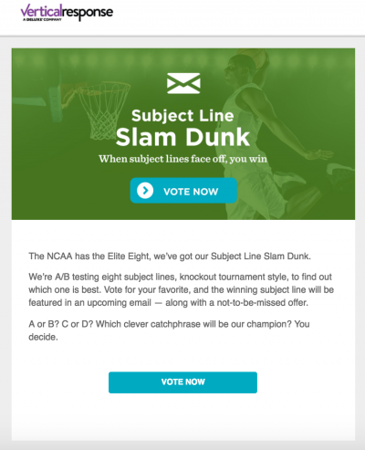 La parentesi è di gran moda a marzo. Quindi crea una parentesi per il tuo marchio come abbiamo fatto qui a VerticalResponse con il nostro contest Slam Dunk Subject Line. Puoi chiedere ai clienti di votare i loro prodotti preferiti e poi mettere i vincitori l'uno contro l'altro in una battaglia a eliminazione diretta in stile torneo. Annuncia il vincitore con uno sconto su quel prodotto.