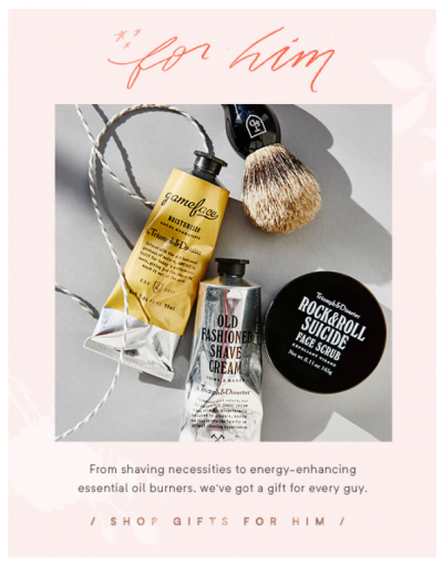 Invia ai tuoi clienti un elenco di regali romantici che possono ritirare presso la tua attività. Il marchio di abbigliamento e lifestyle Free People ha creato un "Negozio di articoli da regalo di San Valentino", una collezione curata di articoli che sarebbero fantastici per i migliori amici o le migliori metà.