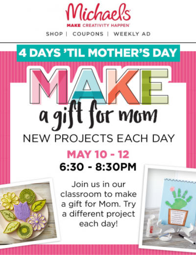 Tutti conoscono una mamma che merita un riconoscimento. E indipendentemente dal tipo di attività che hai, puoi rendere omaggio o celebrare le mamme ovunque. Puoi fare un'offerta speciale "Porta tua madre" o "Le mamme ottengono una percentuale speciale di sconto". Il rivenditore di arti e mestieri Michaels ha organizzato un evento di artigianato per la festa della mamma.