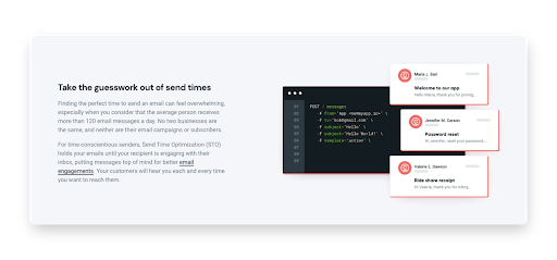 Utilizzando strumenti basati sull'intelligenza artificiale come Send Time Optimization di Mailgun , puoi inviare e-mail personalizzate nel momento preciso in cui è più probabile che vengano aperte e coinvolte.