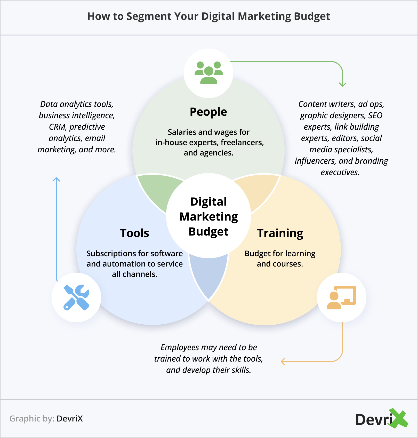 Quando si pianifica come allocare il budget per il marketing digitale, è buona norma iniziare elencando tutti gli elementi che si sommano alle spese. Questi implicano quanto segue: