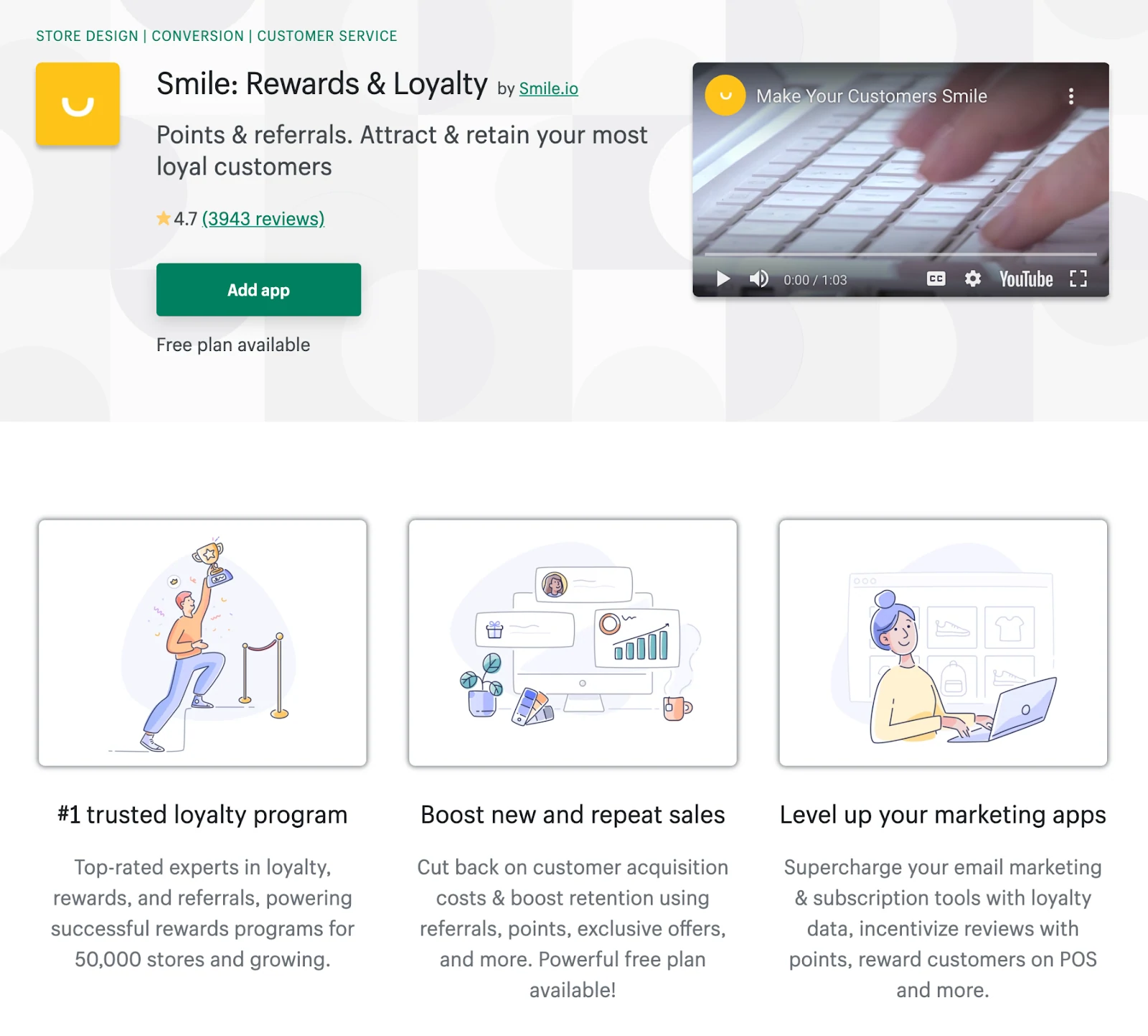Aziende come Sorriso può aiutarti a creare un programma fedeltà gratuitamente, con piani pro disponibili per ulteriori personalizzazioni. Se hai un negozio Shopify, puoi aggiungere il Sorriso app al tuo negozio e crea facilmente un programma fedeltà.
