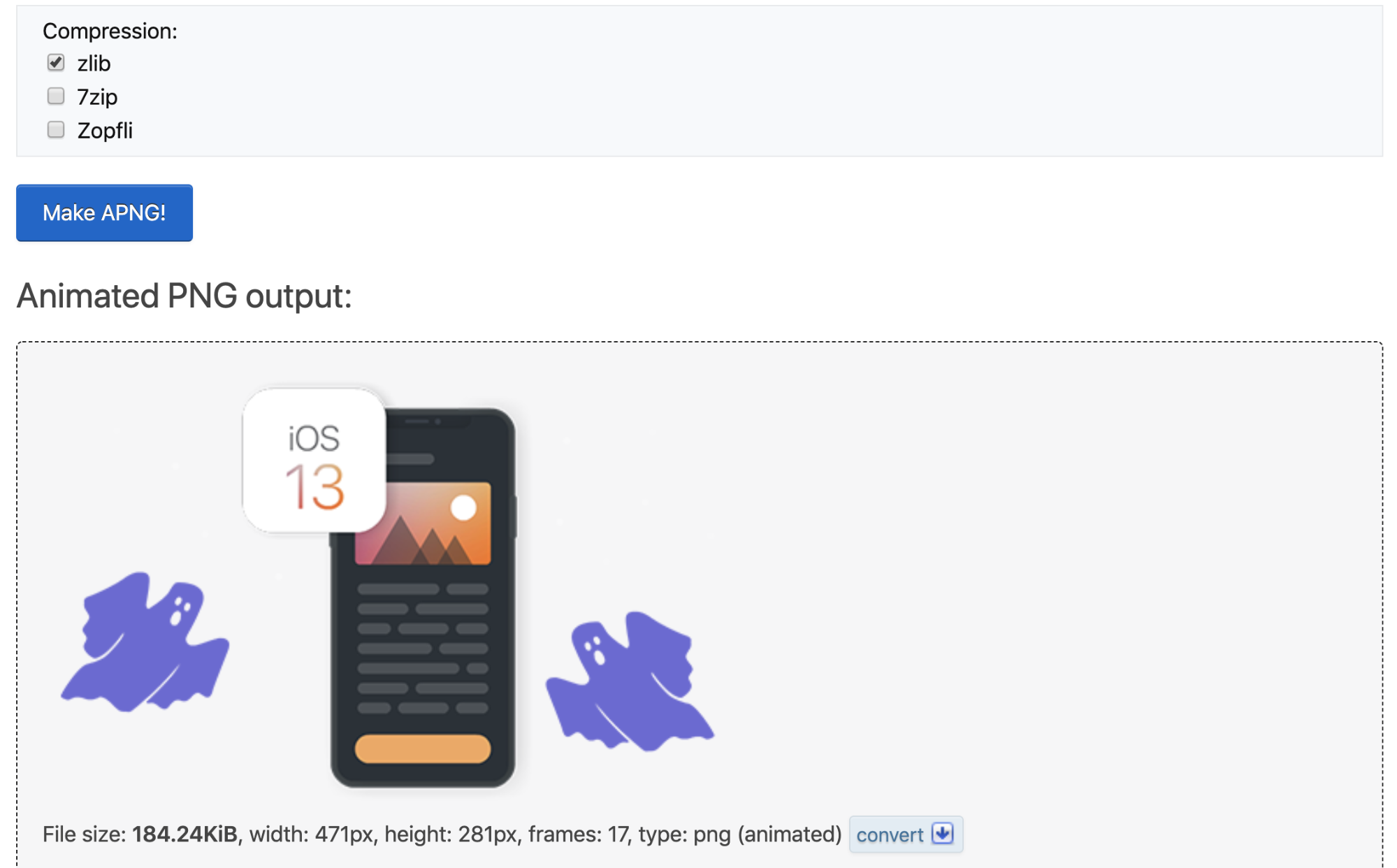 Come le GIF, le APNG possono diventare rapidamente piuttosto pesanti. La riduzione dei colori e del numero di fotogrammi utilizzati aiuterà a mantenere basse le dimensioni dei file. La compressione zlib standard sembrava essere l'unica opzione che funzionava per i nostri file, e una volta che abbiamo premuto Make APNG! pulsante, potremmo vedere un esempio della nostra animazione e la sua dimensione del file prima del download. Questa è un'ottima occasione per apportare ulteriori modifiche, come alterare la velocità o rimuovere qualche frame in più, prima del download.