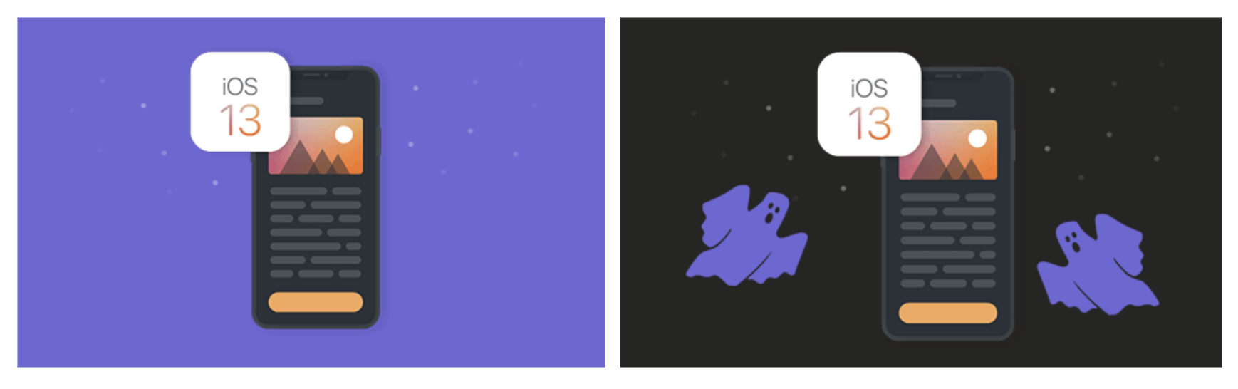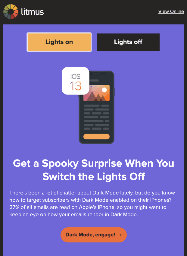 Per nascondere le animazioni nella versione brillante dell'e-mail, le abbiamo progettate nello stesso colore dello sfondo su cui erano posizionate nella versione brillante. Quando un abbonato "spegneva le luci", quei colori di sfondo cambiavano e, sorpresa, rendevano visibili le nostre animazioni spettrali!