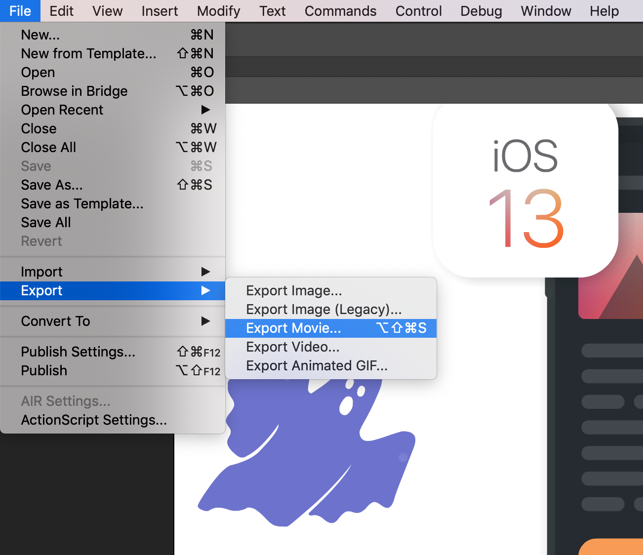 Usiamo Adobe Animate per creare le nostre animazioni, non importa se si tratta di una GIF o di un APNG. La differenza, tuttavia, è che Adobe Animate non offre un'opzione nativa per esportare un file APNG. Invece, dovrai esportare ogni fotogramma come un singolo PNG. Dopo aver creato la tua animazione, vai su Esporta > Esporta filmato e seleziona "Sequenza PNG" dal menu a discesa.