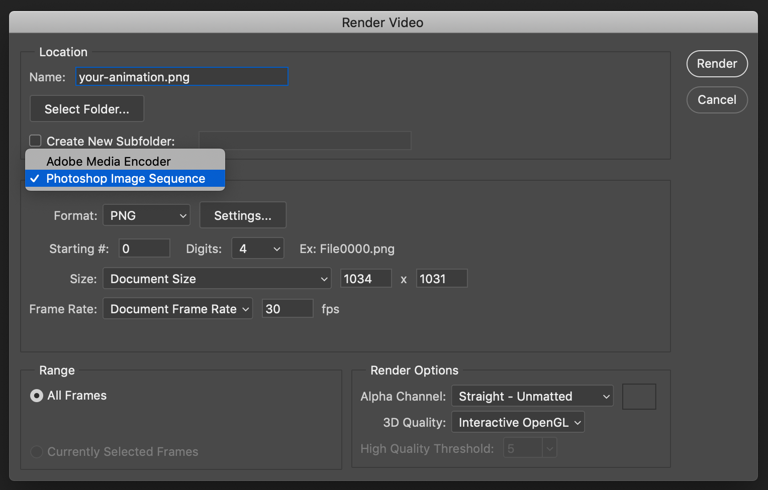 Il processo in Photoshop è molto simile. Vai su File > Esporta > Rendering video . Nel pannello Render Video , seleziona "Sequenza immagini Photoshop" dal menu a discesa e scegli PNG come formato. Devi fare un altro passo per assicurarti che i tuoi png siano trasparenti: nella casella Opzioni di rendering seleziona "Straight - Unmatted" dal menu a discesa "Alpha Channel" . Dopo aver selezionato dove si desidera salvare le immagini, premere il pulsante Render .