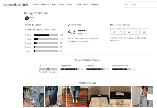 Abercrombie and Fitch si sta appoggiando pesantemente anche a valutazioni e recensioni. Invece di costringere i potenziali acquirenti a scorrere centinaia di recensioni per vedere se un prodotto è adatto, generano un rapporto basato sui dati dalle loro recensioni e mostrano un riepilogo specializzato di tali informazioni.