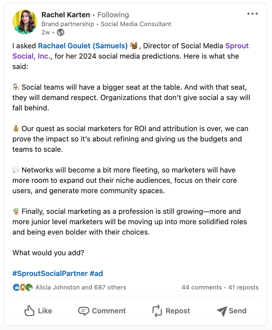 Ciò è particolarmente potente per i marchi B2B che creano contenuti di leadership di pensiero. Collaborare con un influencer affermato nel tuo settore può amplificare in modo significativo la portata dei tuoi contenuti, estendendo la tua esperienza oltre i confini dei tuoi canali organici.