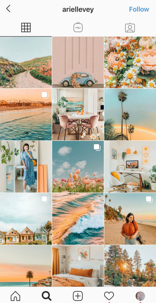 - Queste tonalità sono così complementari che non devi preoccuparti di sopraffare. Cerca di bilanciare il tuo feed con i tipi di contenuto (come un ritratto o un piatto) per mantenerlo inaspettato e fresco!